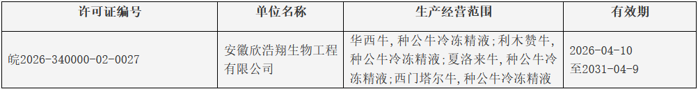 畜牧法》《種畜禽生產經營許可管理辦法》《種畜禽生產經營許可審查規范》《農業農村部關于印發新一輪全國畜禽遺傳改良計劃的通知》等相關規定,經形式審查、書面審查、專家現場評審和種公牛冷凍精液質量檢測合格,批準發放安徽欣浩翔生物工程有限公司種畜禽生產經營許可證。地址:安徽省亳州市利辛縣望疃鎮長河場村民委員會以南900米,有效期為5年。
